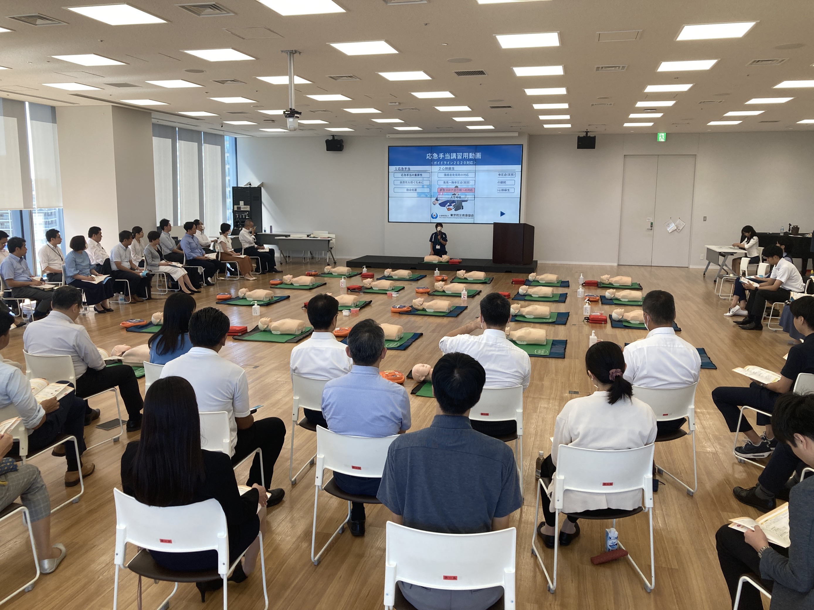 そこで防災月間の取り組みの一環として、9月1日に東京消防庁様に実施いただたいた「普通救命講習」に当社社員も10名が参加しました。