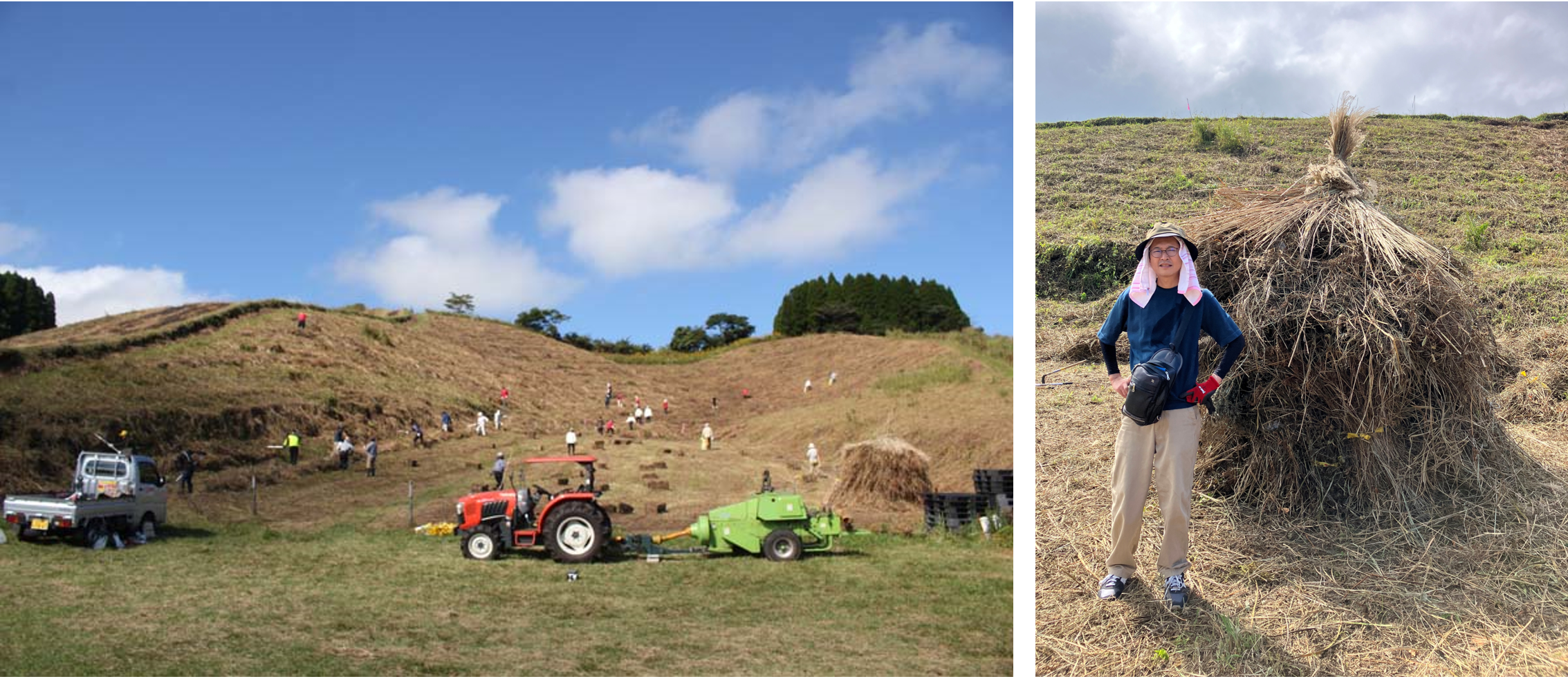 草集めでは、広大な草原に刈り取られた草を集め、野草を梱包して「刈干パック」を作る作業を行います。これらの作業は、草原の維持管理だけでなく、地域の資源を有効に活用する取り組みでもあります。